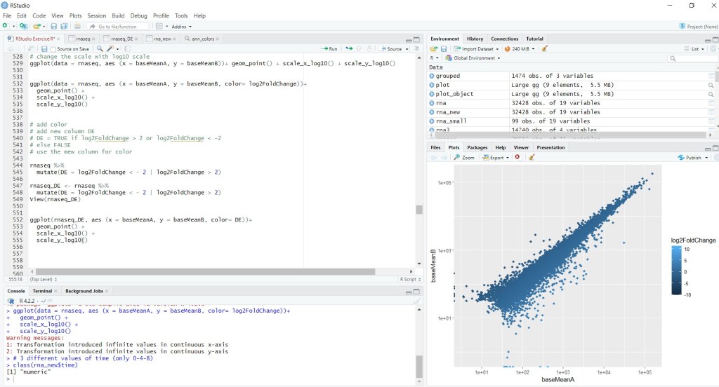 Oliver Rupp taught some basic functions of R Studio during the first afternoon (see above), while several packages were used during the next days to visualize classic data (library package: dplyr, tidyverse, readr, ggplot2; see below) as well as specific RNA Seq data (library package: gridExtra, pheatmap, RColorBrewer), which were generated during the Bioinformatics Workshop done the previous year (2022).