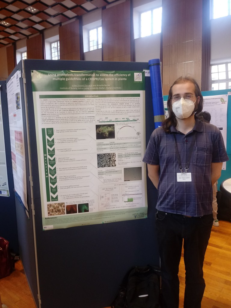 Last month, Julian Garrecht (JLU, Gießen) presented a poster about his PhD project at the Botanik-Tagung 2022 (International Conference of the German Society for Plant Sciences), which took place in Bonn (Germany) from the 28th of August to the 1st of September. His poster (P-298) was titled: “Using protoplasts transformation to assess the efficiency of multiple guideRNAs of a CRISPR/Cas system in planta“. Annette Becker (JLU, Gießen) was his co-author.