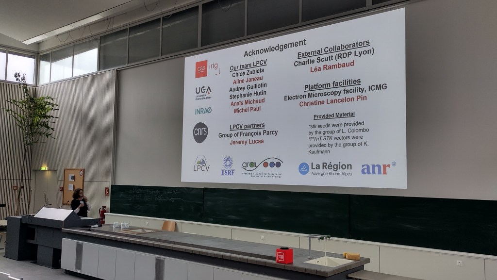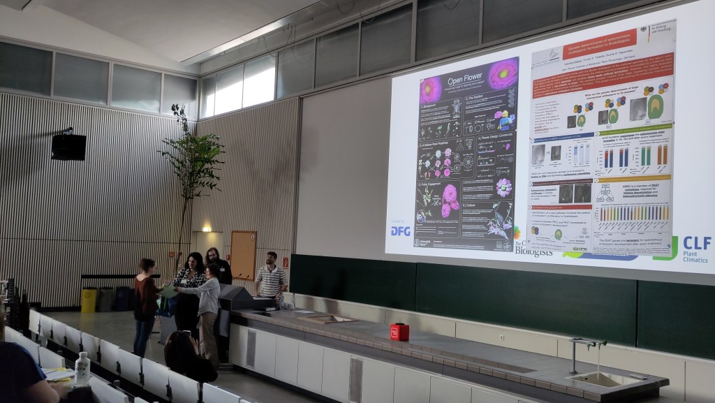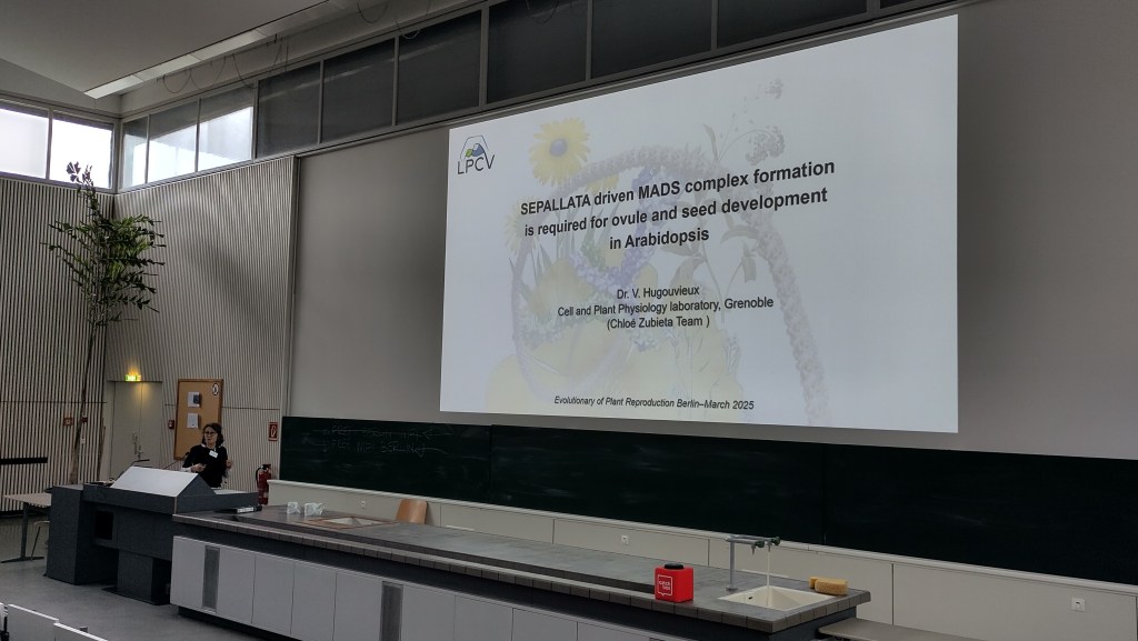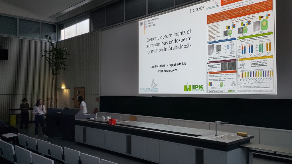 – Camille Salaün (Max Planck Institute – Potsdam – left picture): “Genetic determinants of autonomous endosperm formation in Arabidopsis” (Poster n° 4 – right poster on screen),